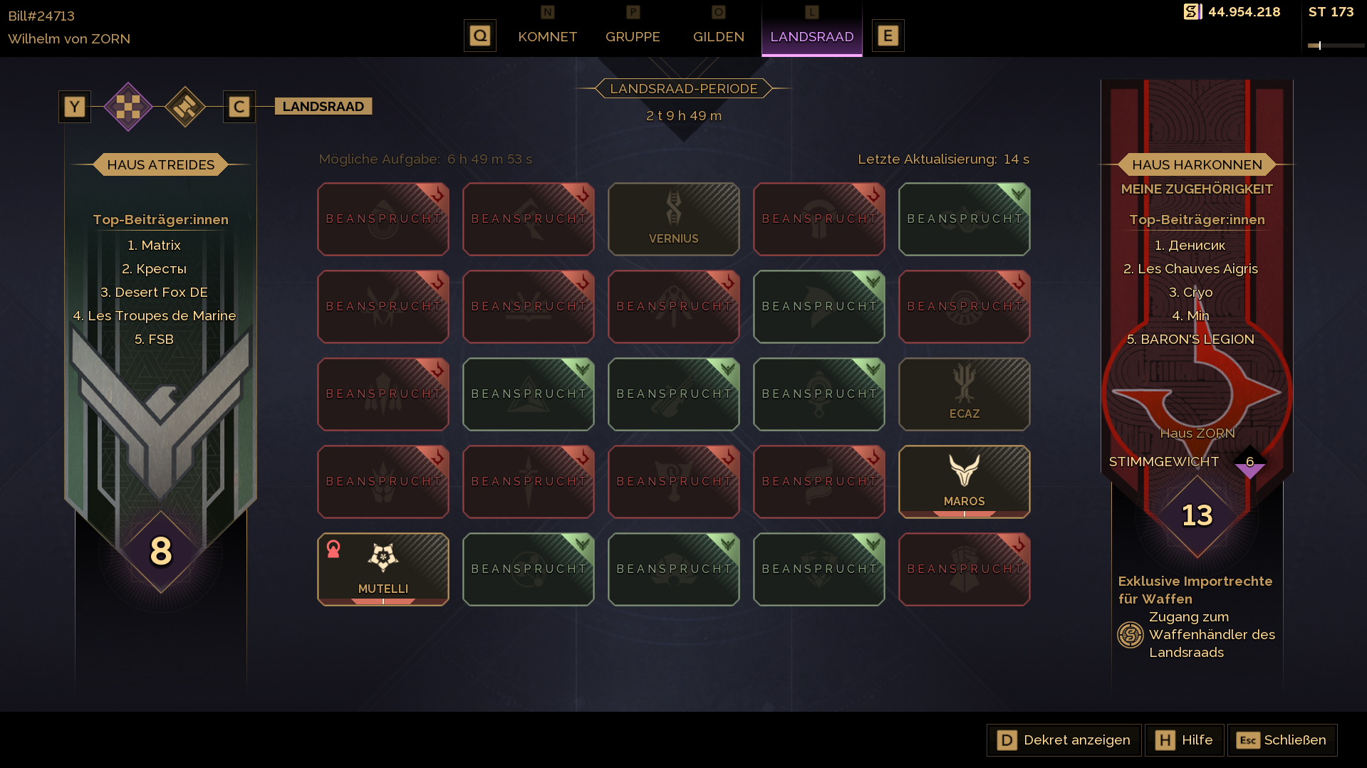In diesem Fenster seht ihr auf der linken und rechten Seite die beiden Fraktionen mit ihrem aktuellen Punktestand und dem jeweiligen Stimmrecht der Gilden. Insgesamt gibt es 15.000 Stimmrechtspunkte, die sich Gilden durch Aktivitäten verdienen können. Dieses Stimmrecht wird gesammelt und kann verwendet werden, um in der Folgewoche über Dekrete mit abzustimmen. Wir befinden uns auf der rechten, roten Seite – also bei den Harkonnen.